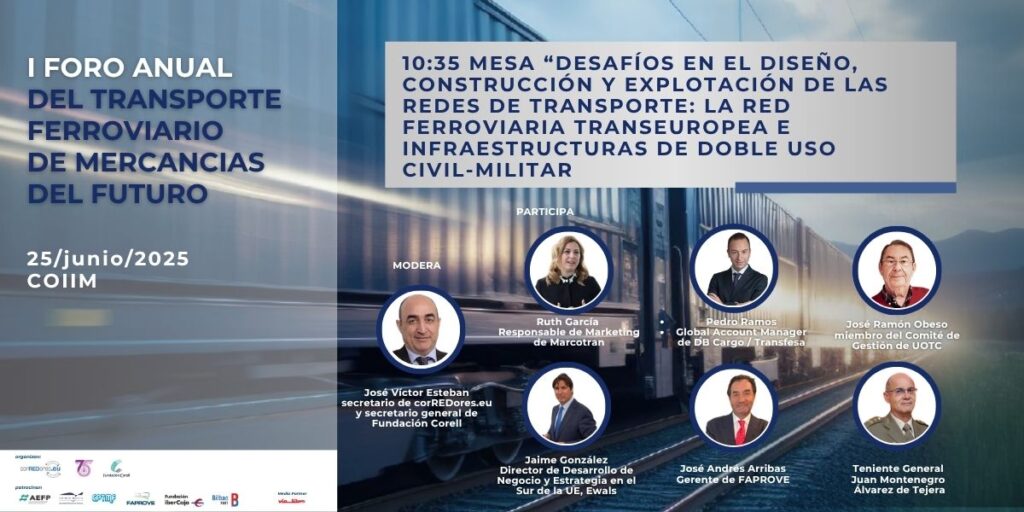 10:35 Mesa “Desafíos en el diseño, construcción y explotación de las redes de transporte: La RED Ferroviaria Transeuropea e Infraestructuras de doble uso civil-militar”. Modera José Víctor Esteban, Secretario de corREDores.eu y Secretario General de Fundación Corell