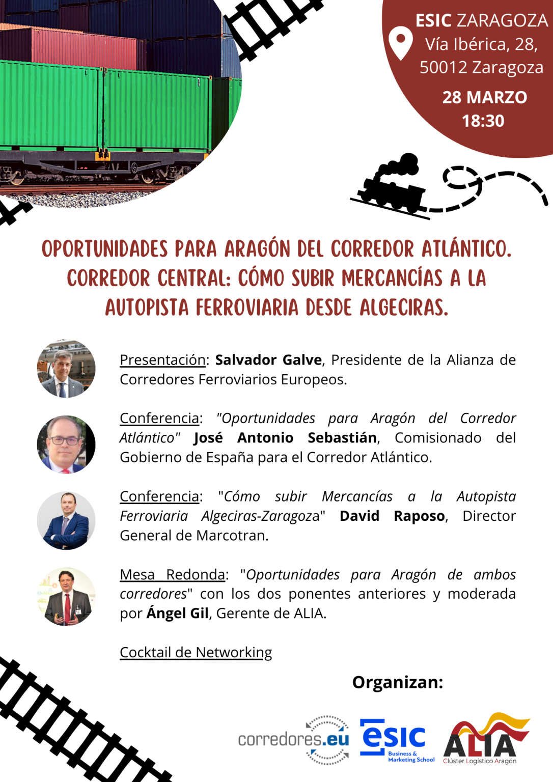 Nuestro presidente Salvador Galve abrirá el acto «Oportunidades para Aragón del Corredor Atlántico. Corredor Central: Cómo subir mercancías a la Autopista Ferroviaria desde Algeciras» que contará con José Antonio Sebastián, Comisionado del Gobierno de España para el Corredor Atlántico, y David Raposo, Director General de Marcotran, como ponentes. La jornada finalizará con una mesa redonda moderada por Ángel Gil, gerente de ALIA.
