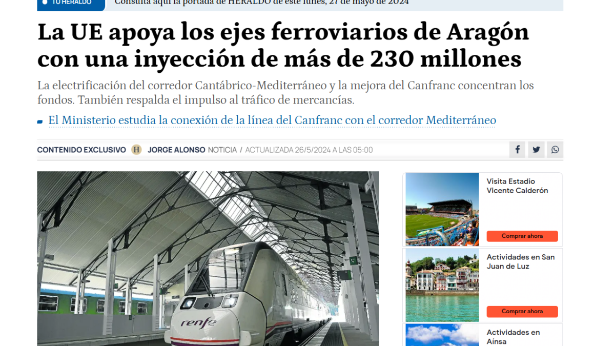 Nuestro presidente habla sobre la inversión en infraestructuras ferroviarias en HERALDO DE ARAGÓN