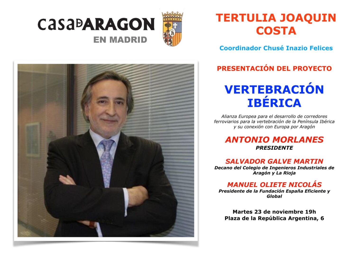 Salvador Galve Martin, Decano del Colegio de Ingenieros Industriales de Aragón y La Rioja, presentó ayer en la Casa de Aragón en Madrid, la Alianza Europea para el desarrollo de corredores ferroviarios para la vertebración de la Península Ibérica y su conexión con Europa por Aragón, VERTEBRACIÓN IBERICA. La conferencia contó con la participación de su residente Antonio Morlanes y Manuel Oliete Nicolás, Presidente de la Fundación España Eficiente y Global, y finalizó con un breve debate entre los asistentes.