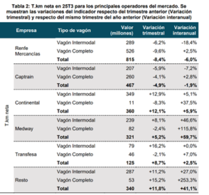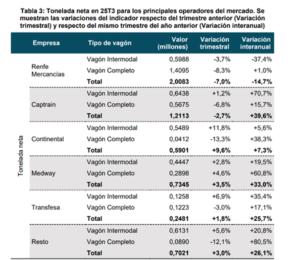Medway, cuarto operador del mercado (13,3% de cuota), gana interanualmente un 60% en t.km netas y Continental (15% de cuota), gana un 6%. Por el contrario, Renfe Mercancías (34% de cuota) y Captrain (19% de cuota) pierden un 6% y un 2% de actividad, respectivamente.