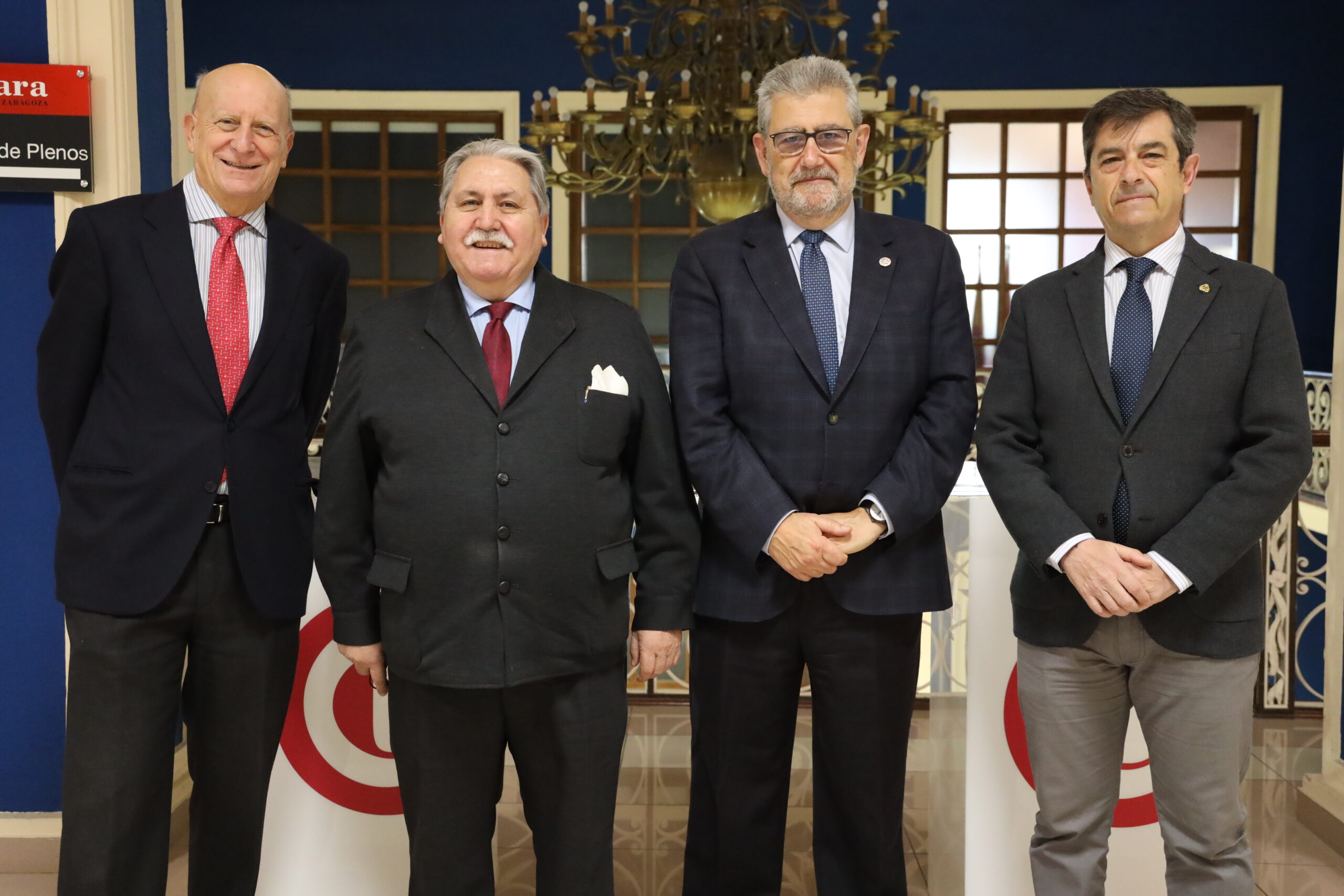 El presidente del Consejo Aragonés de Cámaras Oficiales de Comercio, Industria y Servicios, Manuel Teruel, el rector de la Universidad de Zaragoza, José Antonio Mayoral, y los decanos del Colegio de Ingenieros industriales de Aragón y La Rioja, Salvador Galve, y del Colegio de Ingenieros de Caminos, Canales y Puertos, Javier Mozota, han constituido como asociación jurídica de la Sociedad Civil la Alianza Europea para el desarrollo de corredores ferroviarios para la vertebración de la Península Ibérica y su conexión con Europa. Ha sido esta mañana en la Cámara de Comercio de Zaragoza.