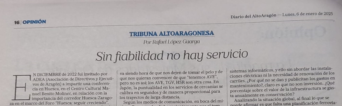 Compartimos este artículo de opinión de nuestro vicepresidente y decano del Colegio de Ingenieros de Camino Canales y Puertos en Aragón, Rafael López Guarga, en el que señala interesantes reflexiones sobre el transporte ferroviario en España.